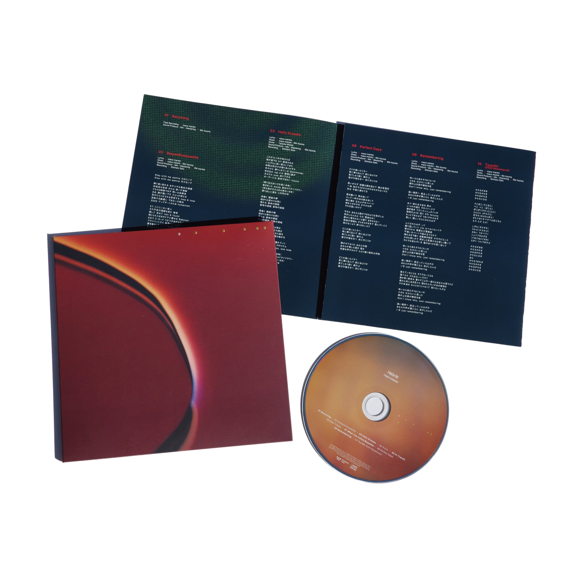2025年12月3日リリース、maco marets 9thアルバム『Helix'95』のCDバージョンが登場。7インチアナログサイズのビッグジャケットに、同じくビッグサイズの歌詞ブックレットを封入した特別仕様です。『Unready』『Wild』など過去のアルバムと同一の規格になります。